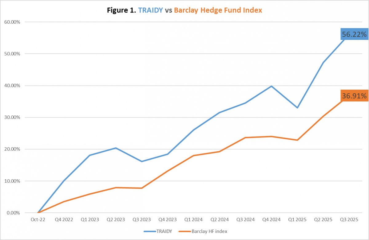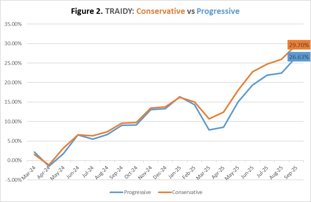 Figure 2 (TRAIDY: Progressive vs Conservative) provides a comparison between the cumulative results generated by the two versions since March 2024. The situation during the first half of 2025 provides an environment favourabale to the conservative version. This figure also shows that TRAIDY’s risk management is effective.